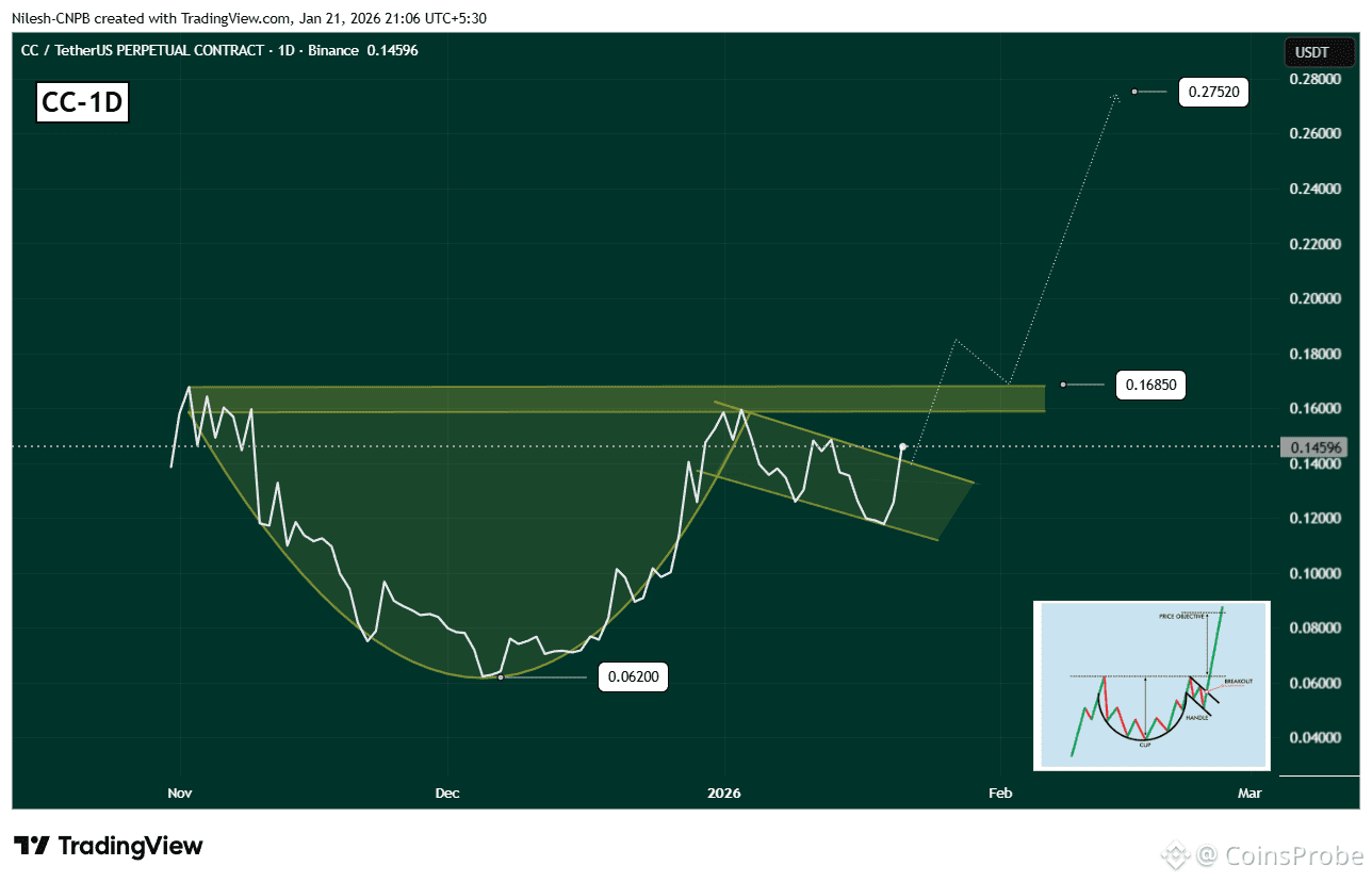 Beyond the price jump, what’s drawing attention is the technical structure forming on the daily timeframe, which now suggests that CC may be entering the early stages of a larger bullish move.