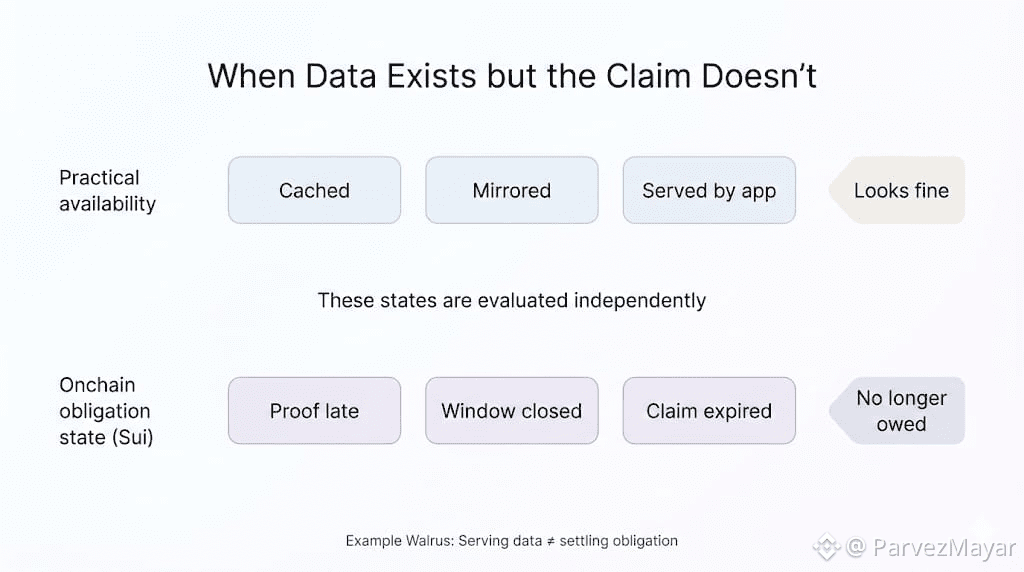 The blob on Walrus might still be retrievable in practice cached, mirrored or whatever....and yet the claim fails to settle. Proof lands late. Renewal does not clear. The app still serves the blob from cache, support says "it's fine', and then the counterparty asks for the onchain proof.
