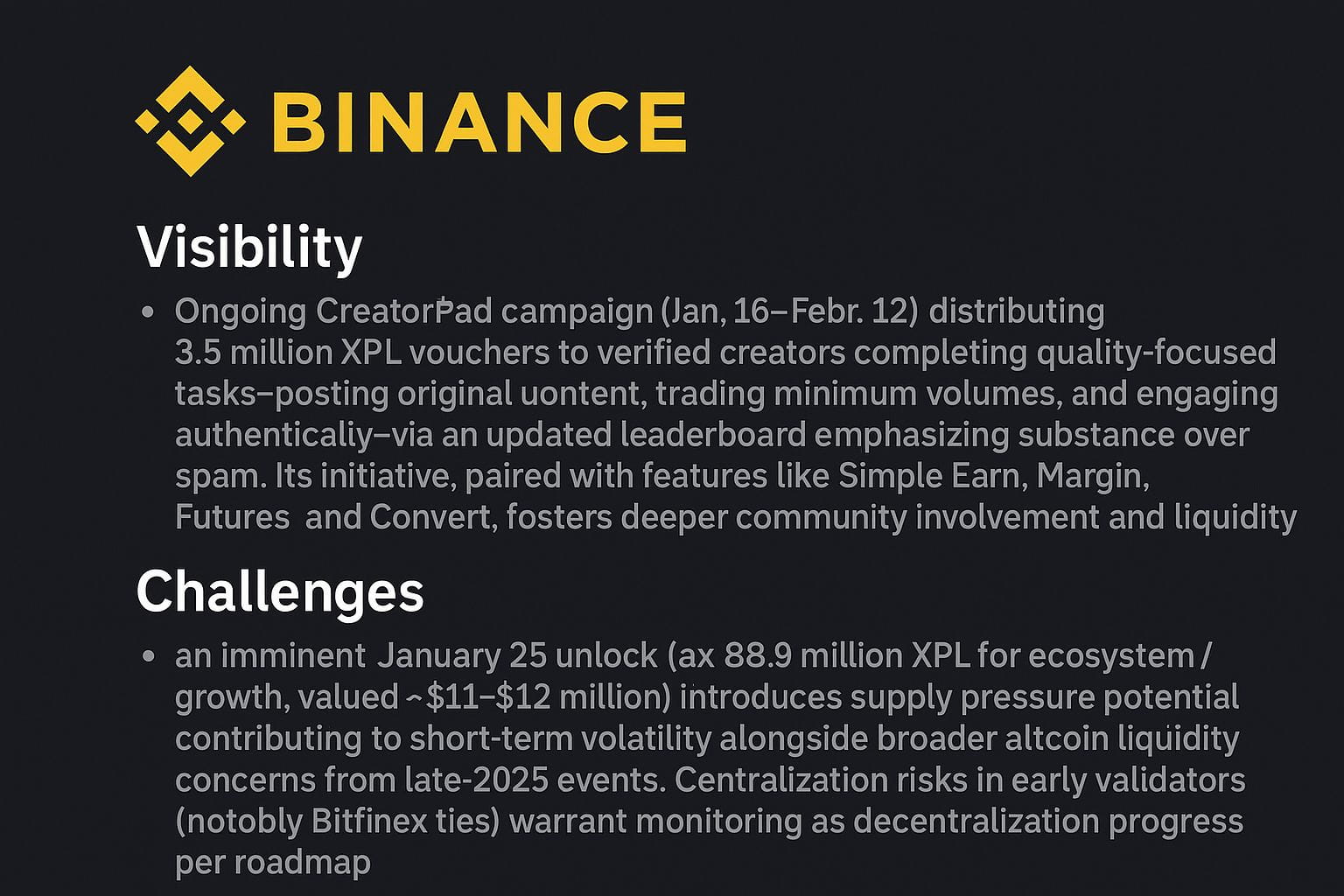 Binance remains a focal point for visibility. The ongoing CreatorPad campaign (January 16–February 12) distributes 3.5 million XPL vouchers to verified creators completing quality-focused tasks—posting original content, trading minimum volumes, and engaging authentically—via an updated leaderboard emphasizing substance over spam. This initiative, paired with features like Simple Earn, Margin, Futures, and Convert, fosters deeper community involvement and liquidity.