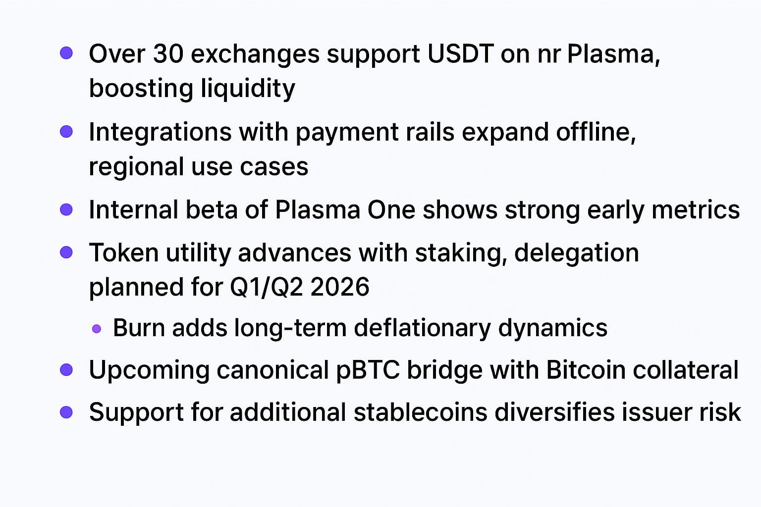 Token utility advances with staking and delegation activation targeted for Q1/Q2 2026, allowing holders to secure the network, earn rewards from tapering inflation (starting ~5%), and participate in governance. An EIP-1559 burn on base fees adds long-term deflationary dynamics. Upcoming canonical pBTC bridge will introduce Bitcoin collateral without custodians, while support for additional stablecoins diversifies issuer risk.