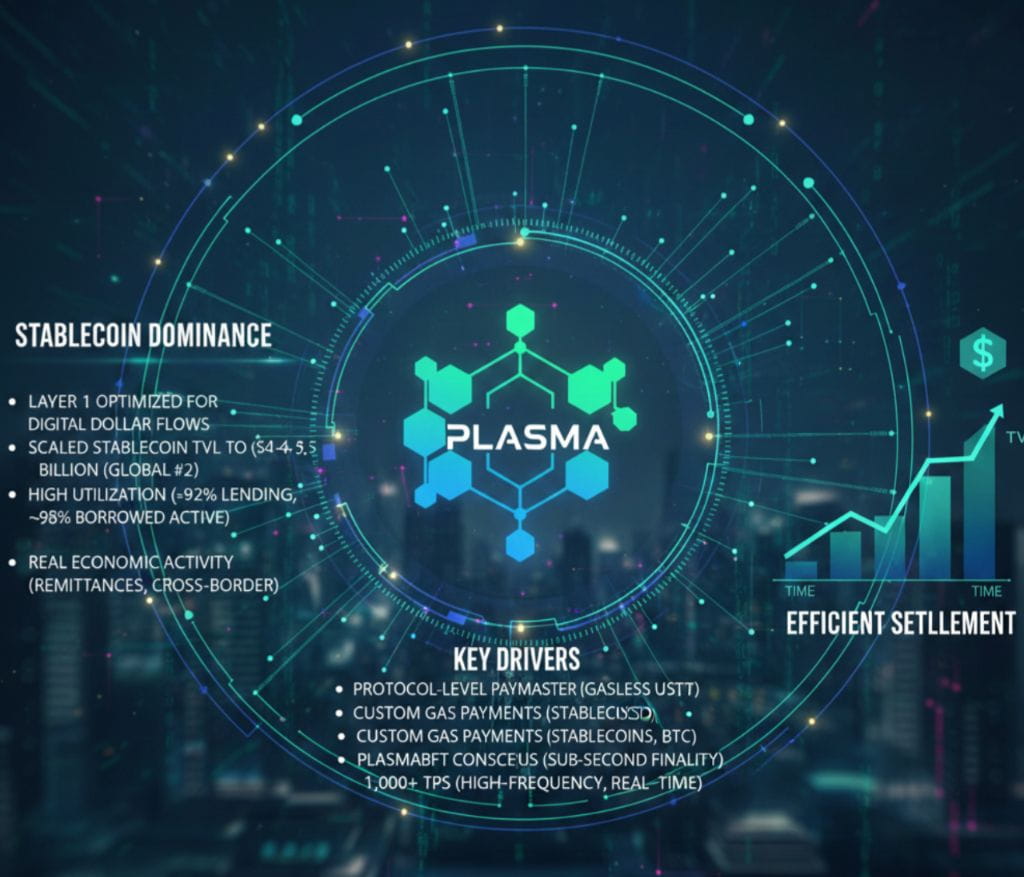 The project's strength lies in its unwavering commitment to stablecoin dominance. As a Layer 1 optimized solely for digital dollar flows, Plasma has scaled stablecoin TVL to approximately $4–$4.5 billion, securing second place globally in this metric. Utilization remains exceptionally high: lending pools operate at ~92% capacity with nearly 98% of borrowed assets in active use, reflecting genuine demand for efficient settlement rather than speculative parking. This positions Plasma ahead of many generalist chains in real economic activity, particularly for remittances, merchant processing, and cross-border payouts.