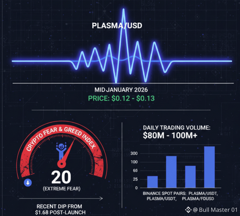@Plasma enters mid-January 2026 navigating a volatile market phase, with its price stabilizing around $0.12–$0.13 amid broader crypto sentiment influenced by extreme fear levels (Fear & Greed Index at 20). Despite recent dips—down from highs near $1.68 post-launch—the token maintains robust daily trading volume exceeding $80–$100 million across major venues, including Binance where it ranks prominently in spot activity against USDT, BNB, and FDUSD pairs.