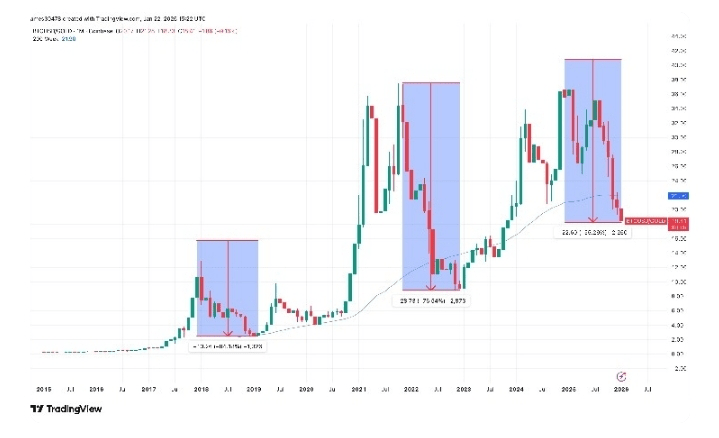 The ratio peaked at nearly 40.9 in December 2024, while since then bitcoin has fallen approximately 55% against gold. In previous cycles, even deeper declines were observed, with a drop of 77% during the bear market of 2022 and an 84% drop in the 2017 to 2018 cycle.