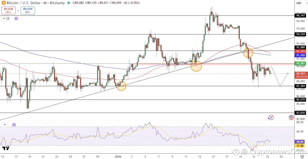 On the technical front, Bitcoin is trading near $89,000, and despite recent weakness, the broader picture still points to consolidation rather than trend failure. Price has pulled back to a rising trendline that has supported the move higher since $83,800, showing buyers remain active on dips.
