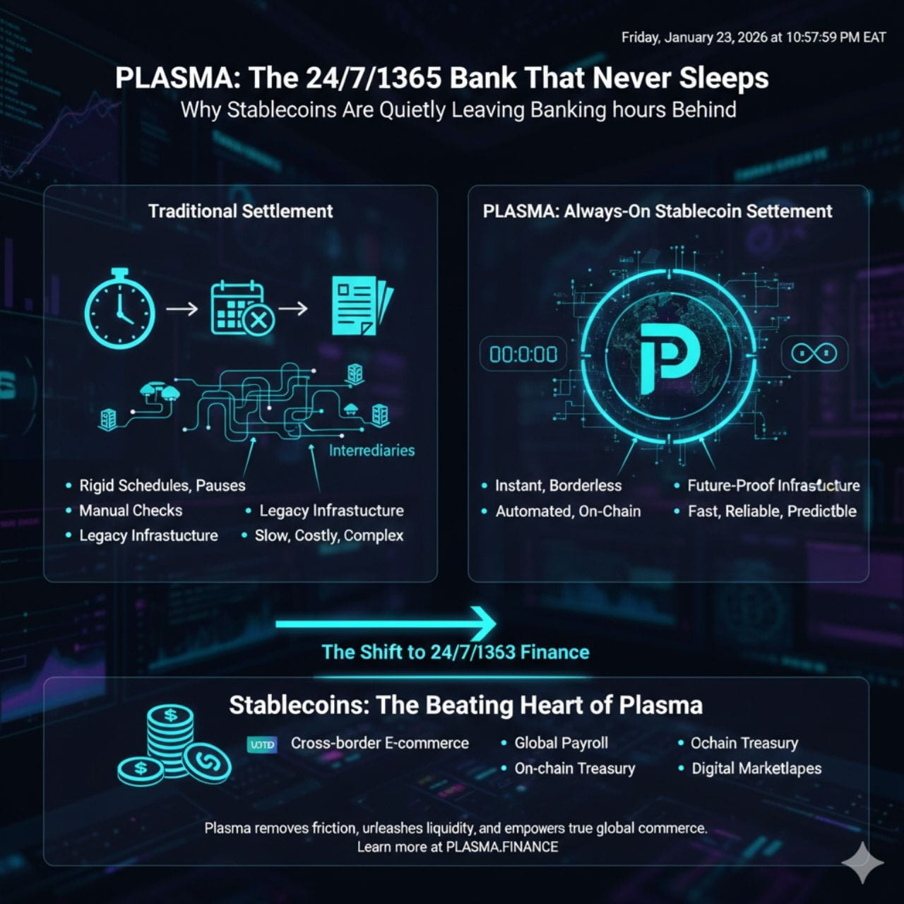 Plasma turns that old model upside down. Picture a digital bank that never shuts its doors, engineered specifically for the unique needs of stablecoins. The vision is simple but powerful: enable money to move freely, instantly, without being held hostage by banking hours, arbitrary cutoffs, or legacy infrastructure. No more waiting for settlement windows or being trapped by the limitations of yesterday’s financial rails.