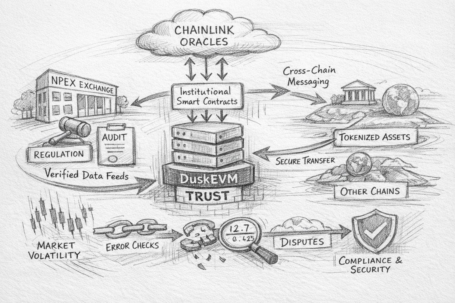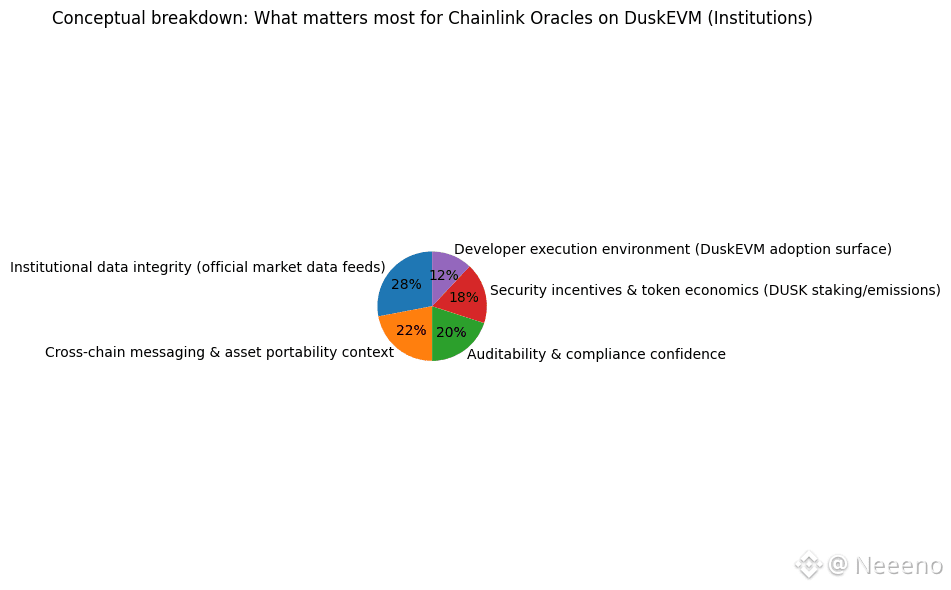 $DUSK The first thing you learn, living close to DuskEVM, is that “data” is never just data. In a regulated market, a number on-chain is an obligation. It is a promise that someone can defend in front of an auditor, and a promise that someone else can safely build on without quietly inheriting legal risk. That’s why the conversation around Chainlink oracles on DuskEVM isn’t really about plugging the outside world into smart contracts. It’s about deciding which parts of reality are allowed to cross the threshold—and under what conditions—when the people using the system are not hobbyists, but institutions that have to survive scrutiny.