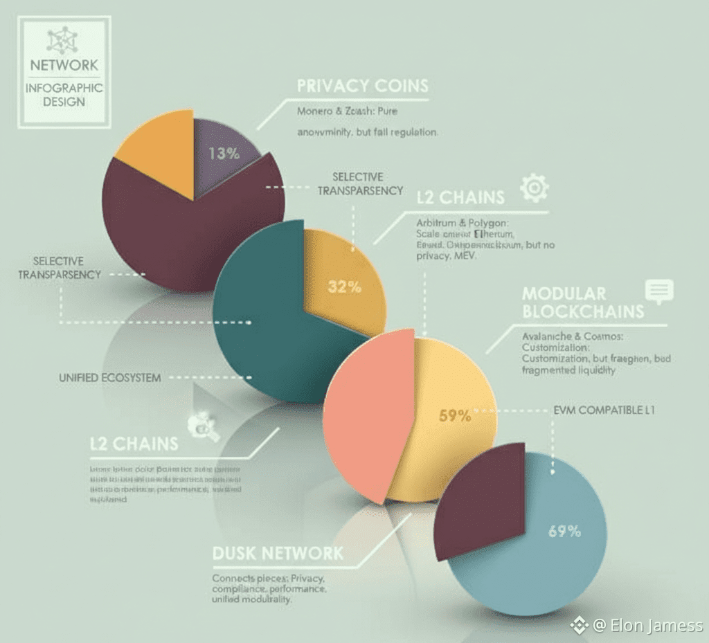 Crypto today feels split into many camps. Privacy coins L2 chains and modular blockchains all try to fix one problem but ignore the rest. Privacy coins like Monero and Zcash protect users but ignore regulation. L2 solutions like Arbitrum and Polygon scale Ethereum but expose all data. Modular chains like Avalanche and Cosmos offer flexibility but break liquidity and security into pieces. Everyone is building fast but no one is building complete. This is why Dusk stands out to me. It does not try to replace everything before it. It tries to connect the pieces that never worked together before.