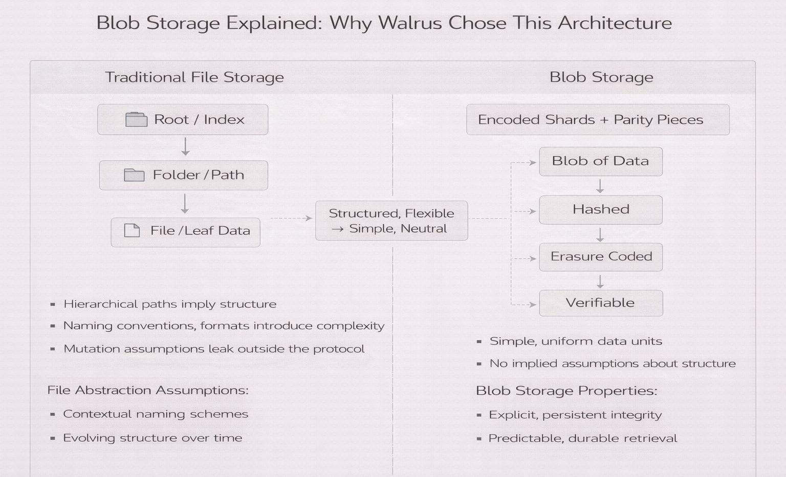 File-based abstractions leak complexity. They make presumptions about naming schemes, directory structures, and mutation patterns that a decentralized system cannot reliably provide. When these presumptions inevitably fail, developers are left to recreate trust and logic outside the system. Blob storage escapes this problem by excising storage down to some minimum guaranteed by the network, including persistence, integrity, and retrievitability.