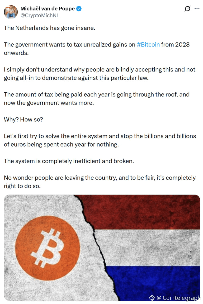 Prominent Dutch crypto analyst Michaël van de Poppe called the plan “insane,” arguing it would sharply raise annual tax burdens and push residents to leave the country. “No wonder people are leaving the country, and to be fair, it's completely right to do so,” he wrote.