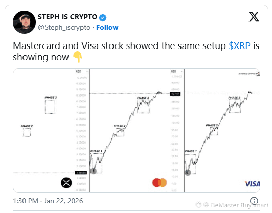 The chart shows XRP moving through three distinct phases, similar to Mastercard and Visa. Phase 1 is the initial accumulation and early breakout. The asset began forming this with its brief resurgence in early January. Following Phase 1, XRP will experience a rapid surge. This move will push it to Phase 2, where another brief consolidation will occur.