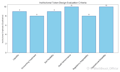 From an institutional standpoint, token design is evaluated less on speculative potential and more on liquidity, accounting treatment, and exit flexibility. Participants need to know whether positions can be entered and unwound without market disruption, whether holding a token creates balance-sheet complications, and whether its function is narrowly defined. Conservative token economics—avoiding tight coupling between core functionality and speculative incentives—lower barriers for organizations accountable to financial statements rather than narratives.
