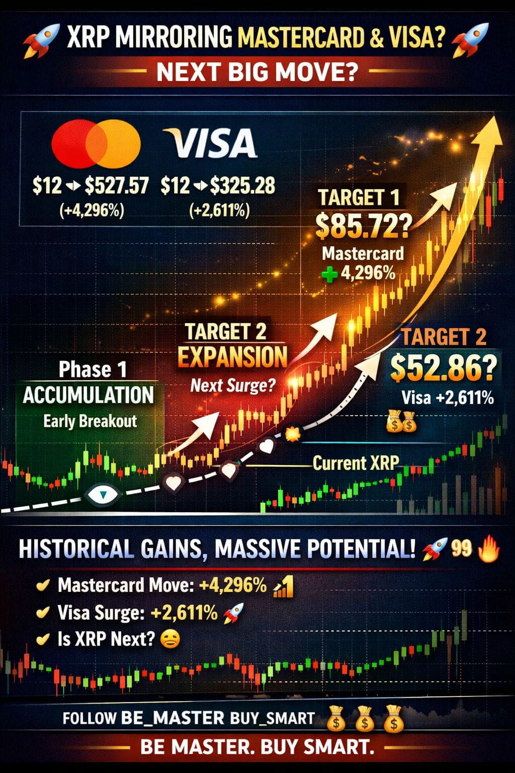 $XRP is lighting up crypto timelines after analyst Steph Is Crypto (@Steph_iscrypto) dropped a chart that has bulls fired up. The comparison? XRPās current structure vs. the early price journeys of Mastercard and Visaātwo payment giants that went on to deliver thousands of percent in gains. š®š