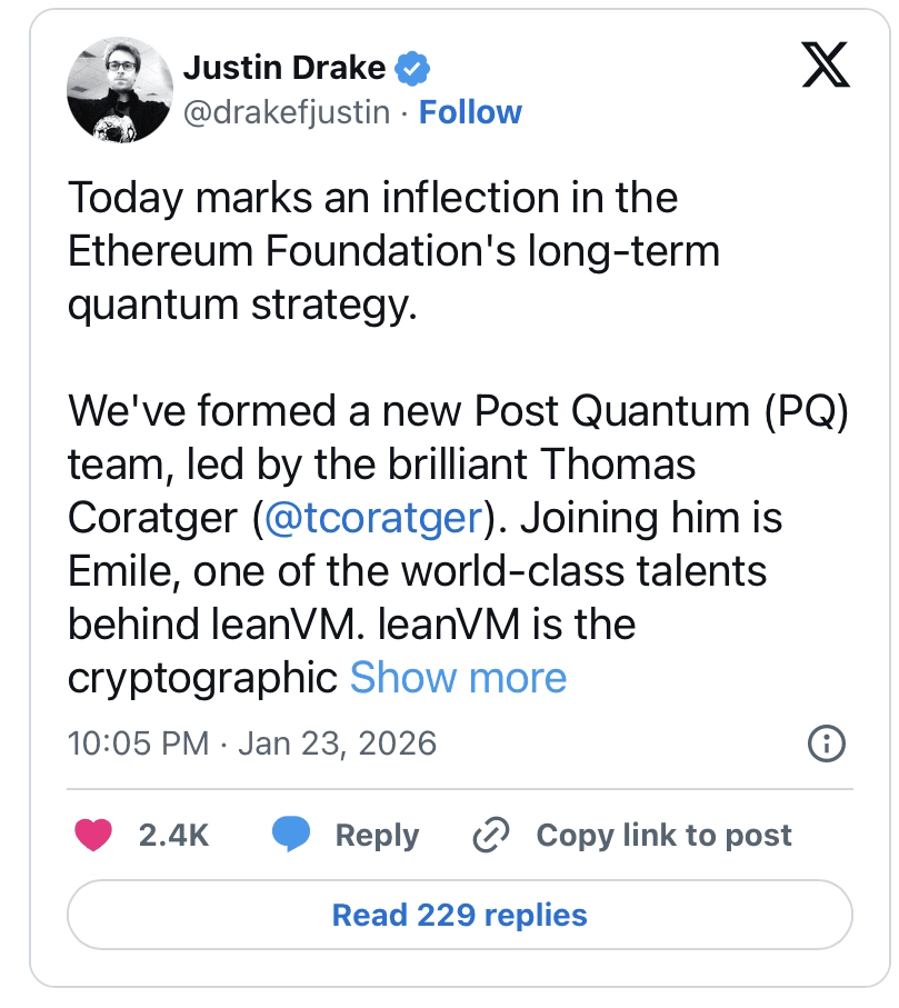 «Our journey began in 2019 with the presentation of Eth3.0 Quantum Security at StarkWare Sessions. Starting in 2024, PQ takes center stage in the leanEthereum concept. The pace of engineering breakthroughs in PQ since then has been simply phenomenal. But now it's 2026, and deadlines are accelerating,» he wrote.