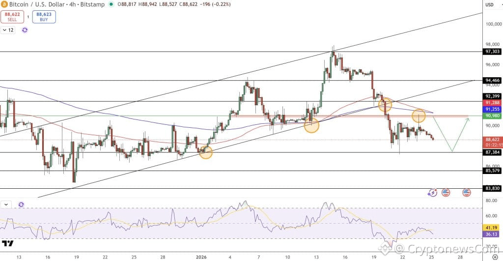 Bitcoin price prediction remains bearish as BTC is trading near $88,600, entering a corrective phase after failing to hold the $97,300 swing high earlier this month. On the 4-hour chart, price has slipped back into a rising channel that guided the move from the $83,800 low.