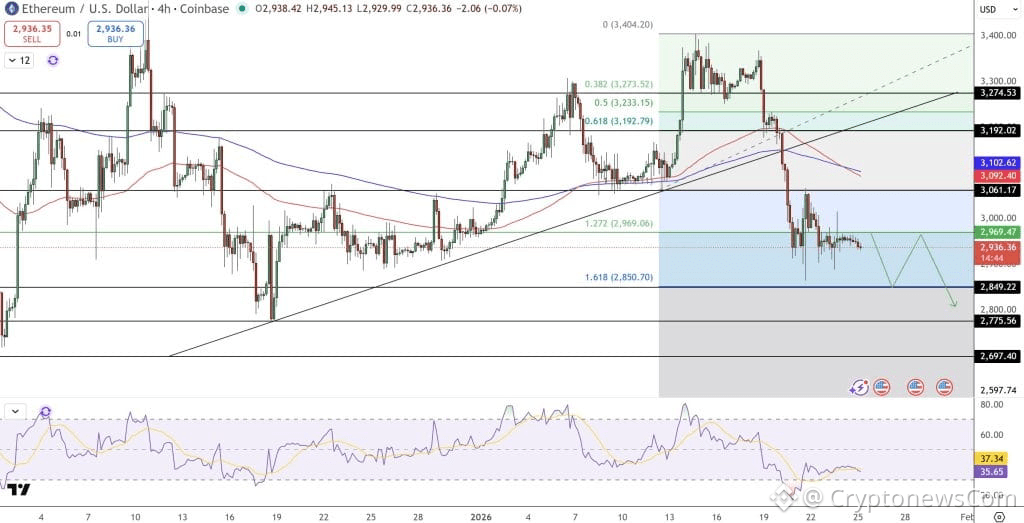 Technically, Ethereum price prediction is bearish as ETH is holding above $2,850–$2,900, a key support zone aligned with prior demand and Fibonacci confluence. RSI remains subdued near 35–40, signaling caution but not capitulation.