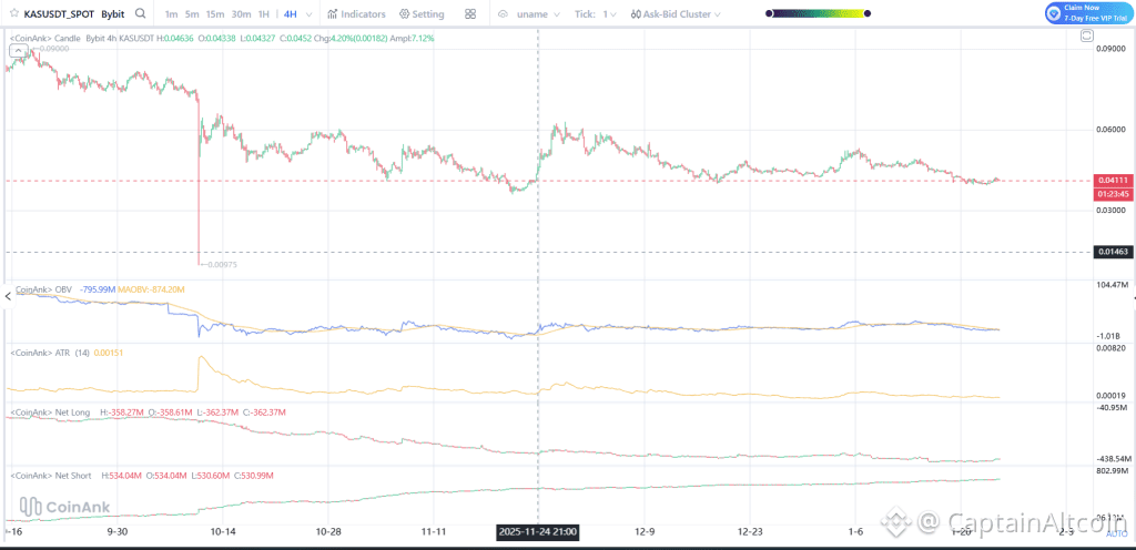 After that major breakdown, the KAS price attempted a recovery toward the $0.060 area but failed to hold it. Since then, price has been moving lower in a controlled and steady manner. Over the past weeks, KAS has been moving sideways between $0.040 and $0.046.