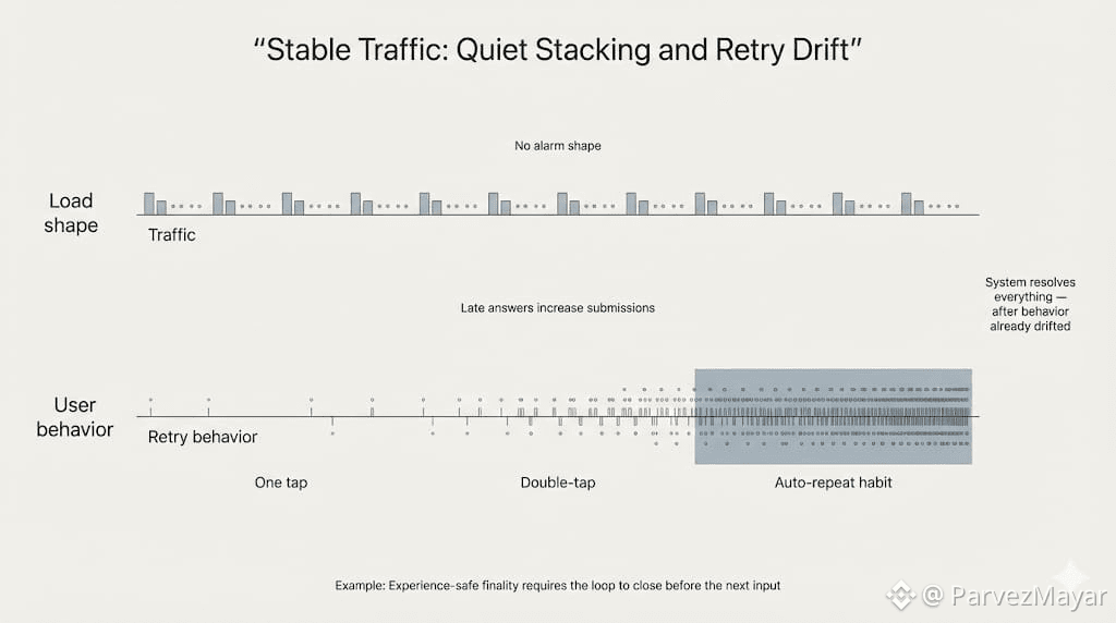 This is why 'stable' traffic is worse than spikes. Spikes are loud. Everyone is watching. Stable traffic is where teams get sloppy... because nothing screams and the chain still has to stay invisible. Sessions overlap. Background actions stack. State refreshes keep arriving. The system is doing more, but it still needs to look like it's doing nothing.