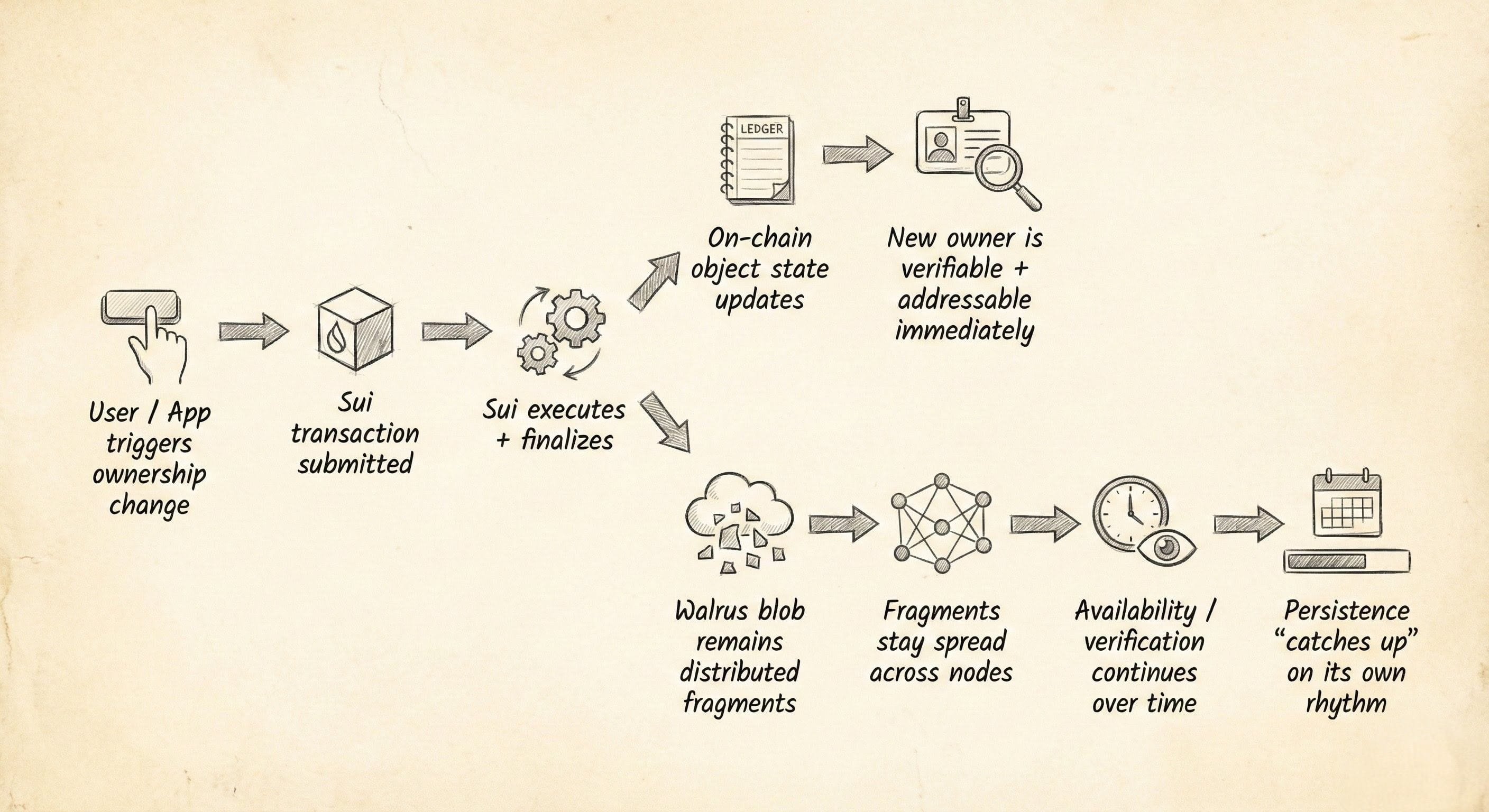 A Walrus (@Walrus 🦭/acc ) blob changes hands through a Sui interaction. The transaction completes cleanly. No rollback. No hesitation. Ownership is clear enough to point at. And yet, the moment doesn’t feel closed. Nothing is wrong, but something hasn’t quite finished arriving.