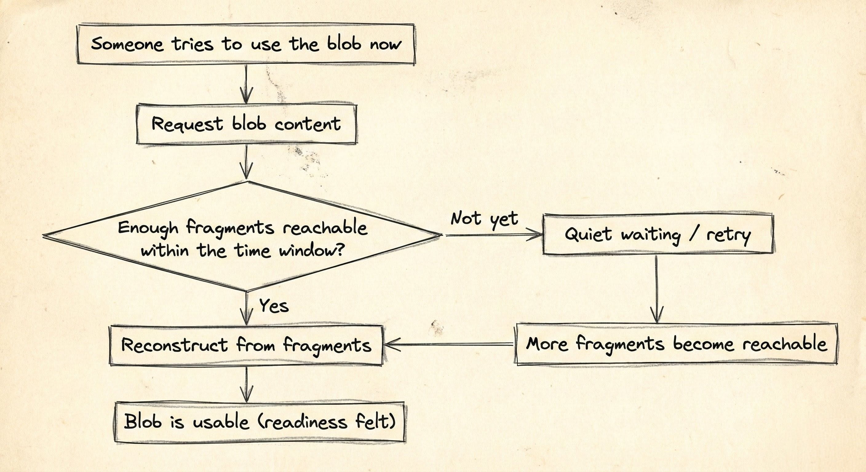Elsewhere, the same Walrus blob exists as distributed fragments. Reconstructible. Persistent. Spread across a decentralized network that doesn’t move at the same rhythm. That state doesn’t contradict ownership but it doesn’t hurry to match it either.