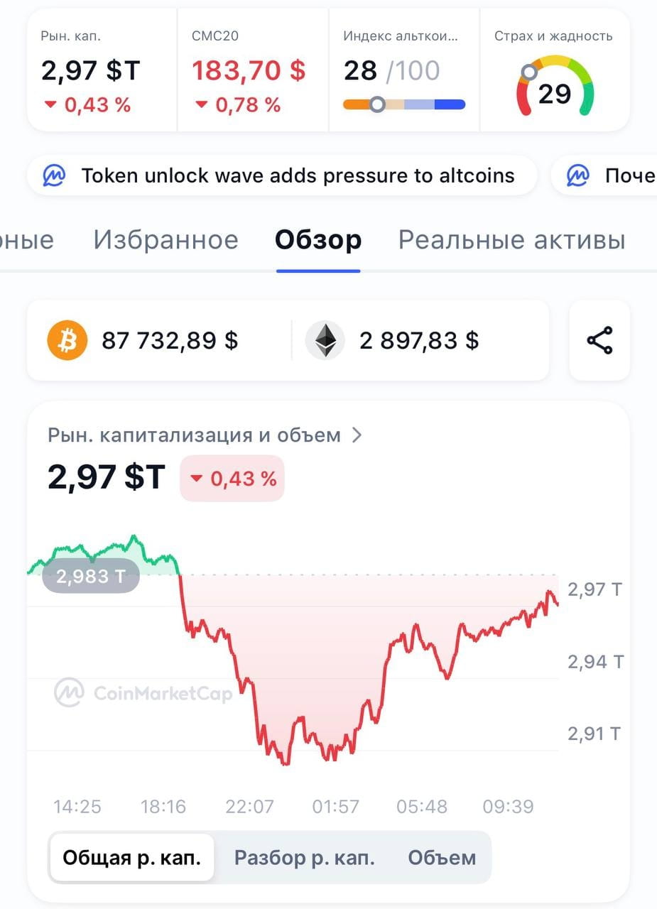 Total market capitalization: Once again fell below the psychologically important mark of $3 trillion, amounting to approximately $2.97 trillion (-1% over 24 hours).
