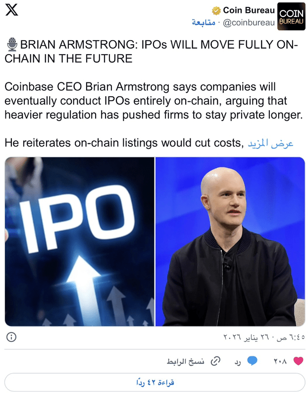 Brian Armstrong, the CEO of Coinbase, expects that initial public offerings will eventually fully transition to the blockchain.