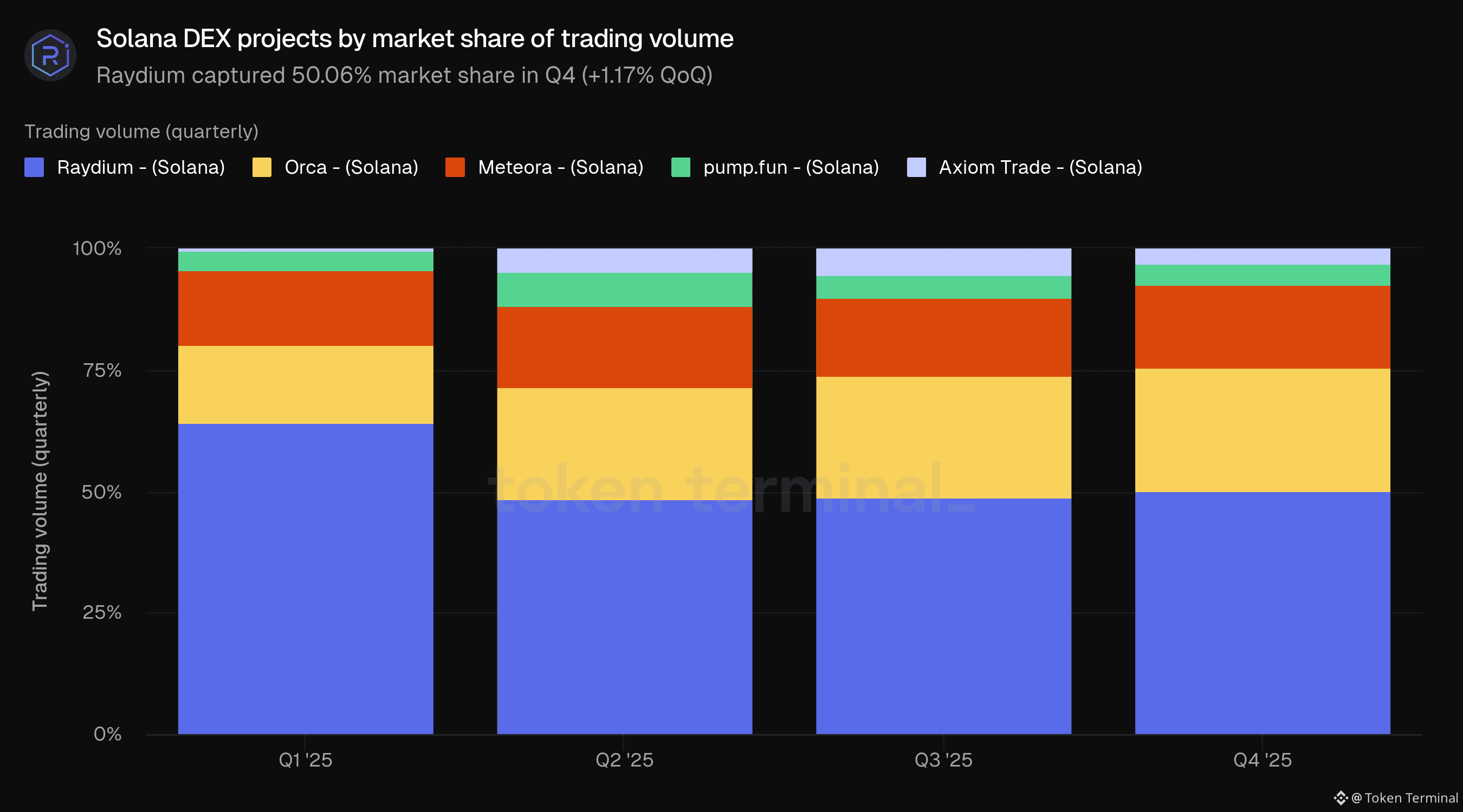 "Q4 2025 marked a period of market-wide consolidation following an exceptional first three quarters of the year. While headline metrics reflected broader Solana ecosystem seasonality and suppressed asset prices, Raydium maintained its competitive position. Raydium even positioned itself as a clear leader over key verticals such as tokenized equity with 54% market share, doubling the next competitor.