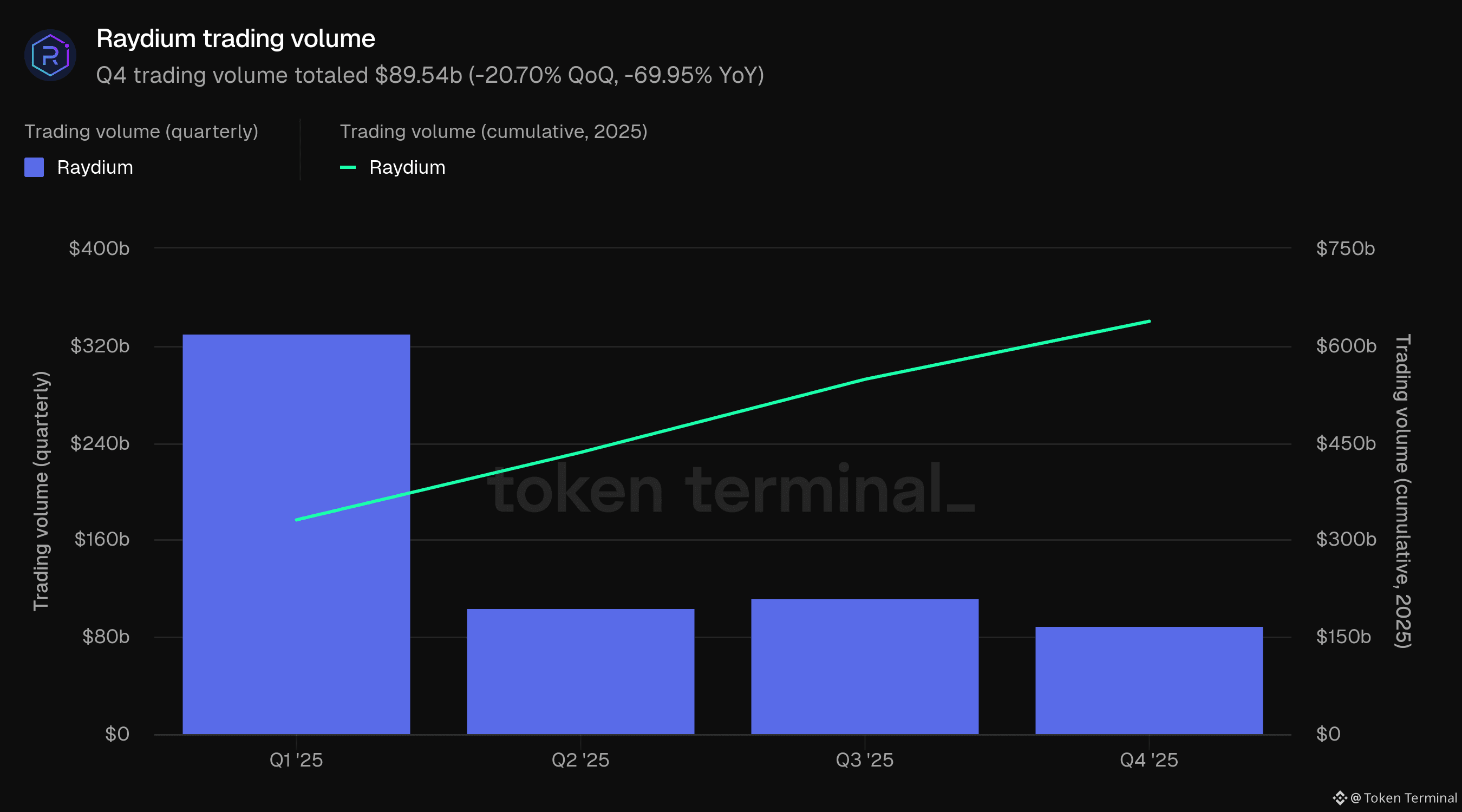 "Q4 trading volume totaled $89.54b, reflecting the natural cyclicality of crypto markets following an extraordinarily active first three quarters of 2025. Despite the quarter-over-quarter decline, Raydium processed cumulative 2025 volume exceeding $600b, a testament to the protocol's scalability and reliability under varying market conditions. Direct trading proved resilient, despite the launch of competing solutions, suggesting a strong retail user retention."