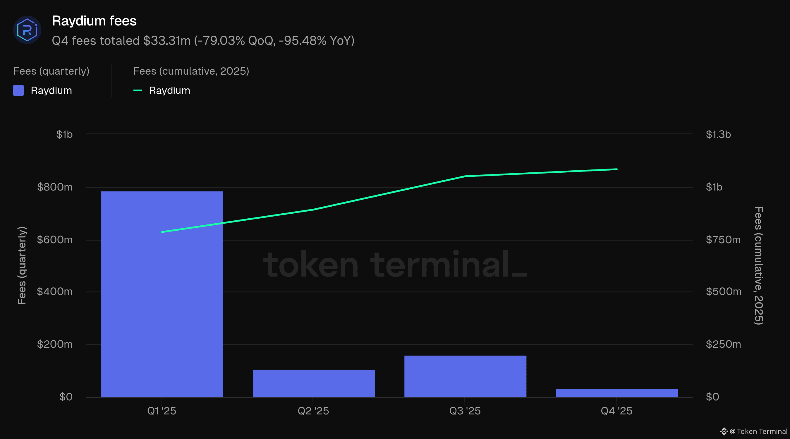 Fees measure the total USD value of fees paid by users across Raydium's trading products. Q4 fees totaled $33.31m, down 79.03% from Q3's $158.89m and down 95.48% from Q4 2024's $737.54m. CLMM represented 59.20% of Q4 fees, followed by OpenBook at 18.56%, CPMM at 17.43%, and LaunchLab at 4.81%.