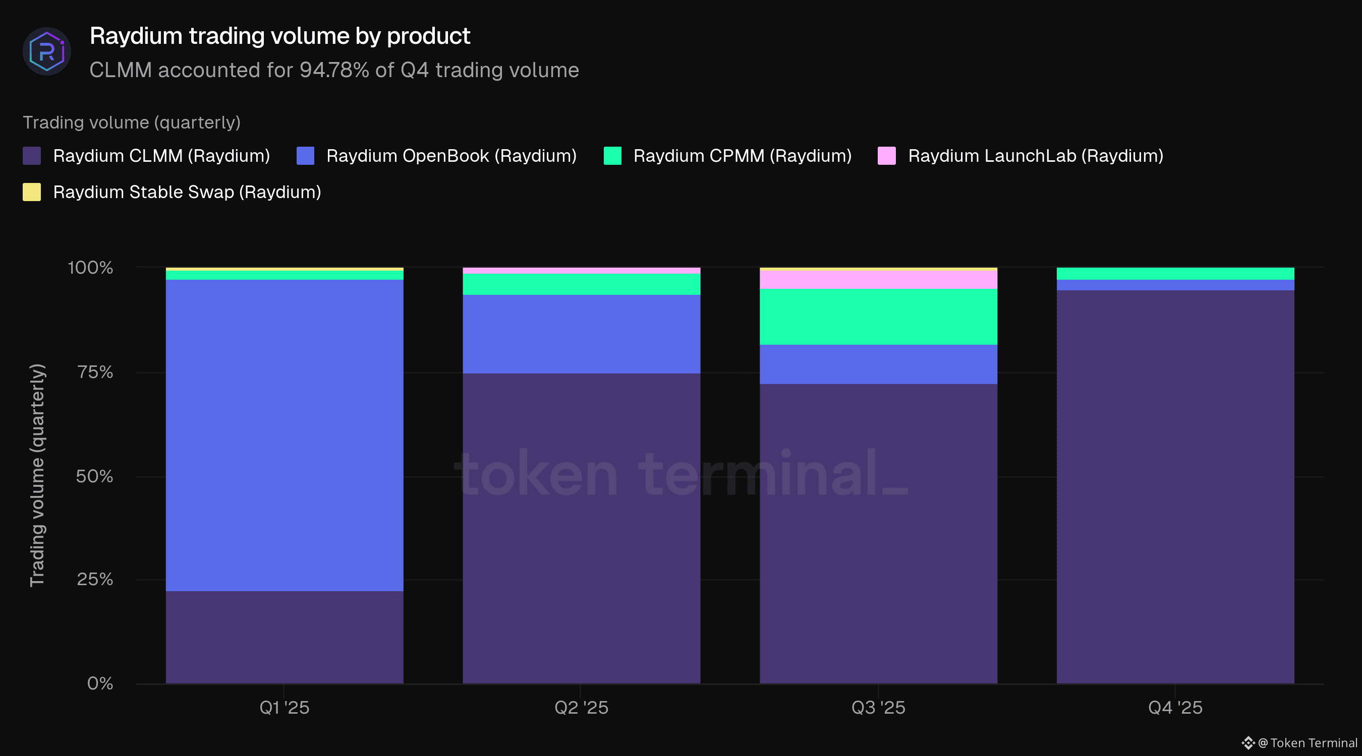 Despite the declines, Raydium strengthened its position in the Solana DEX ecosystem, increasing its market share of trading volume to over 50%. CLMM pools continued to dominate trading activity, representing nearly 95% of Q4 volume while holding only 18% of TVL, demonstrating strong capital efficiency.