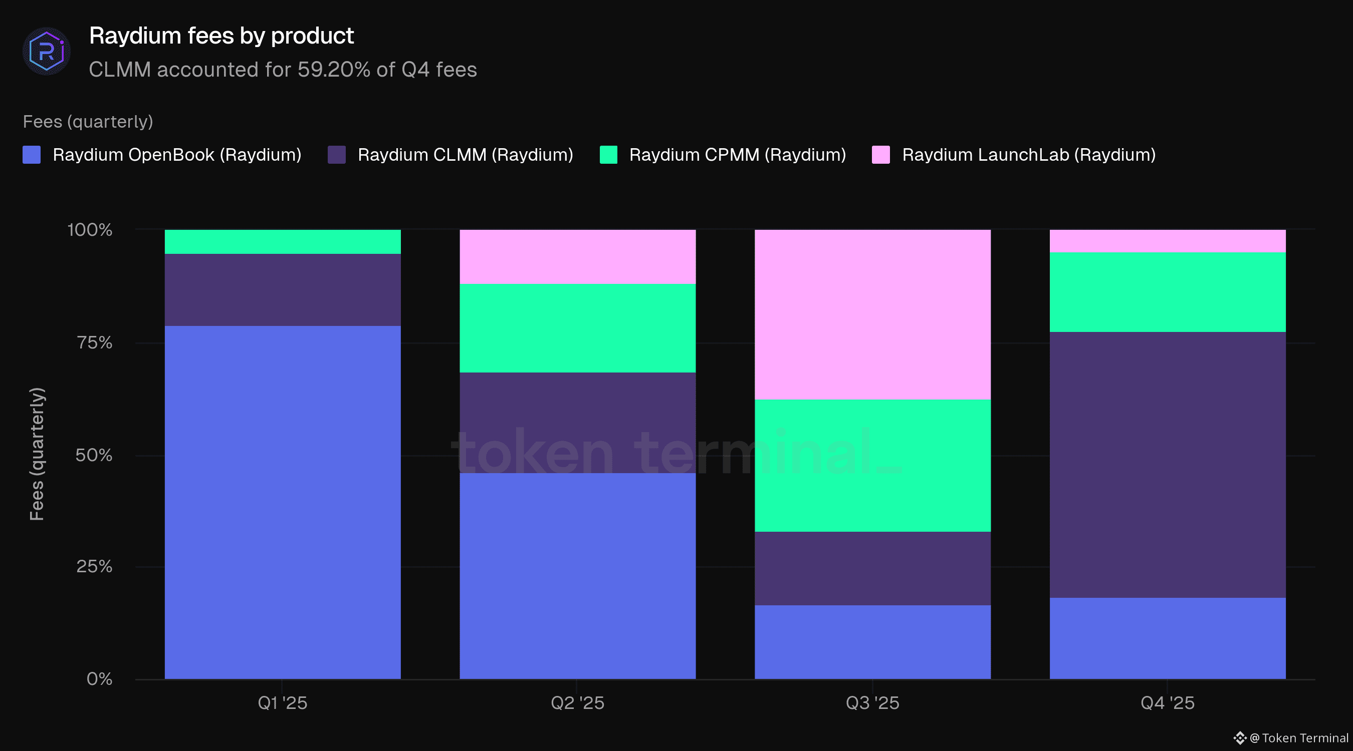 Raydium $RAY launched on Solana in 2021 with a hybrid AMM model that originally combined onchain liquidity pools with a Central Limit Order Book (CLOB). This legacy architecture (OpenBook) now functions solely as a traditional AMM, though it remains the project's foundational layer, retaining roughly 71% of Raydium's TVL. As Solana's trading ecosystem matured, Raydium expanded its product suite with Stable Swap for correlated assets, followed by improved liquidity pools (CLMM and CPMM). In April 2025, Raydium introduced LaunchLab (its native launchpad), extending beyond trading into asset issuance. As a result, Raydium's legacy pools maintain TVL depth, while newer products drive the majority of swap volume and fee generation.