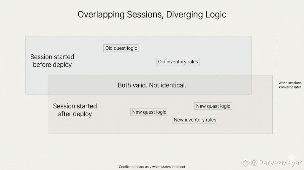 Vanar's Sessions don't politely end so you can ship. They persist, overlap, and carry little truths that were valid ten minutes ago and might not be valid after the next push. Not abstract "state assumptions." A quest flag that meant "complete." An inventory slot that used to accept an item. A progression step that used to be counted the old way. Waiting stops being neutral once "later" stops existing.