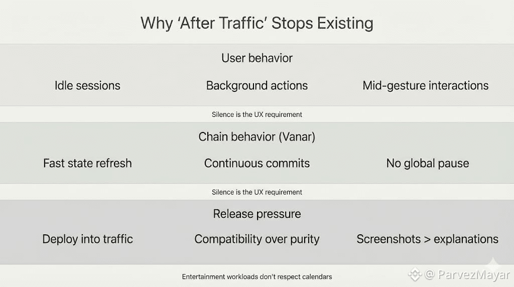 On older stacks, deployment windows were real things. Off-peak hours. Maintenance modes. A quiet stretch where nothing important was happening. Consumer chains like Vanar erase that comfort. Entertainment workloads don't respect calendars. They run when users are bored, curious, halfway through something they don't want interrupted... sometimes inside a metaverse event where everyone is watching the same moment. So releases move forward into traffic instead of around it, and that sentence sounds calm until you have to do it.