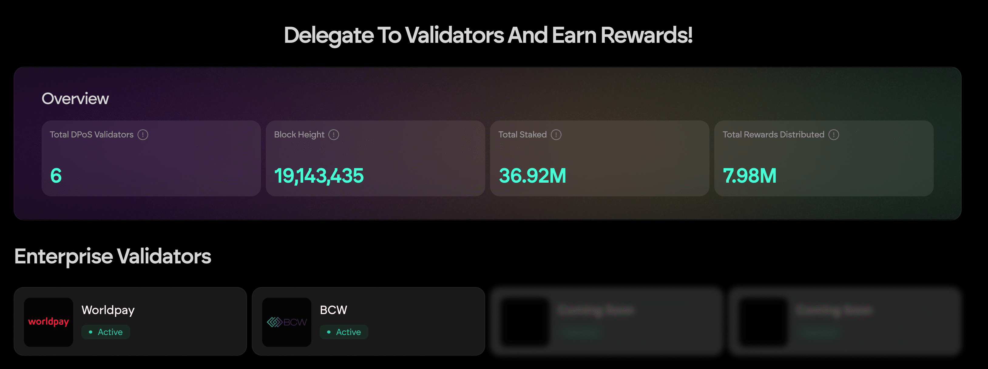Stake $VANRY on the official website to earn rewards. Currently, a total of 36.92M VANRY has been staked, with 7.98M rewards distributed.