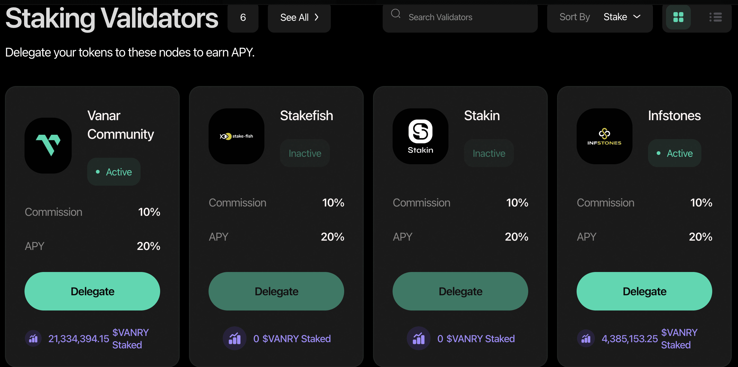 You can delegate $$VANRY to active validators to earn rewards, calculated and distributed every 24 hours. You can choose Vanar Community, which currently has a staking amount of 21.33M.