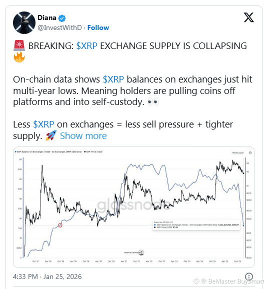 In her post, Diana stated that XRP exchange supply has fallen to multi-year lows, describing the development as a significant shift in holder behavior.