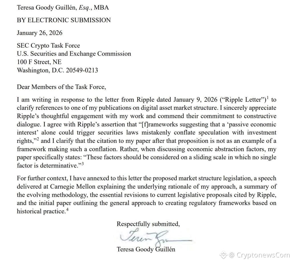 In her letter, Guillén clarified that her own academic work on digital asset market structure had been cited by Ripple not as an endorsement of such conflation, but as part of a broader discussion on how economic factors should be assessed.