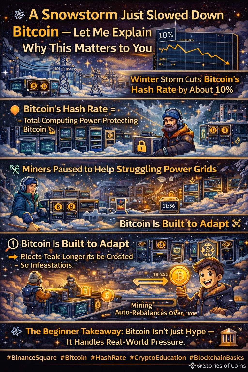When you’re new to crypto, it’s easy to think Bitcoin only moves because of traders, whales, or headlines. I used to think that too. But this week, something very real happened: a winter storm caused Bitcoin’s hash rate to drop by around 10%. And that tells you a lot about how this network actually works.