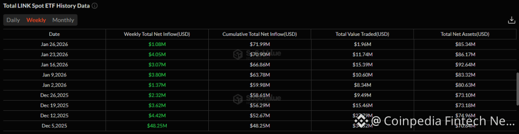 According to on-chain and ETF tracking data, spot LINK ETFs have already accumulated more than 1% of Chainlink’s total circulating supply, with a market cap of $8.42 billion. The 1% makes the Total net assets across the products approximately $85.34 million.
