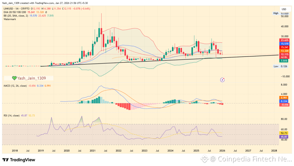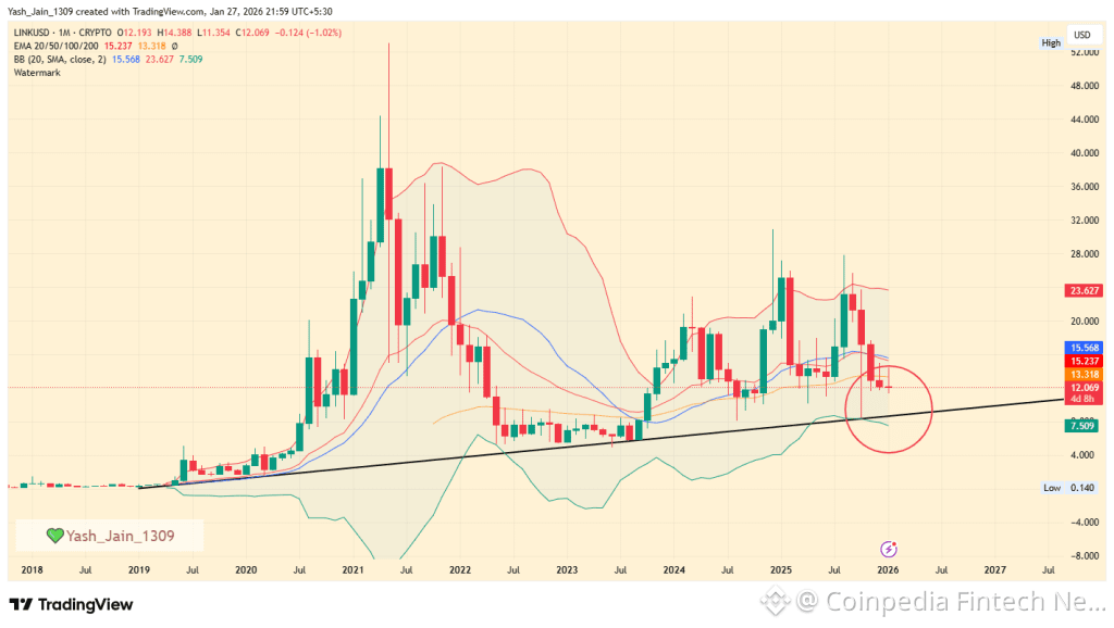 From a broader technical angle, LINK crypto’s monthly structure shows that major uptrends have typically started only after a decisive monthly closing candle on its long-term ascending trendline. That confirmation has not occurred since 2023. The current decline may therefore represent the type of drawdown institutions often seek before re-engaging more aggressively.
