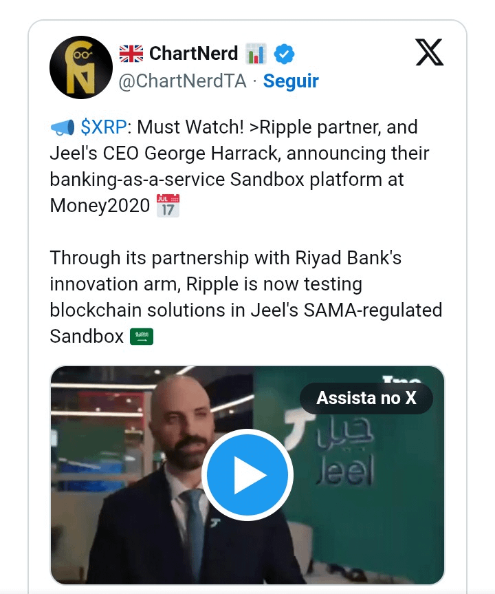 They stated: 'We announced at Jeel our partnership with Ripple to explore advanced applications, improve the speed and efficiency of payments, study use cases for the custody of digital assets, and develop prototypes in Jeel's experimental regulatory environment, in support of the objectives of #SaudiVision2030.'