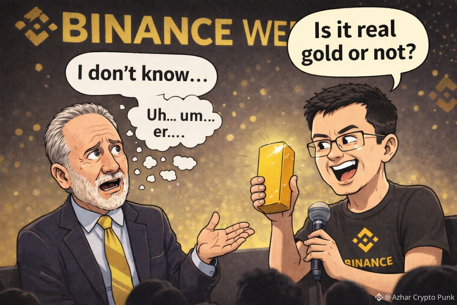 The funniest moment at Binance Week Dubai 2025 didn’t come from a chart, a keynote, or a price prediction. It came when CZ casually handed Peter Schiff a piece of gold and asked a question that should have been easy for the world’s loudest gold maxi: “Is this real gold?”