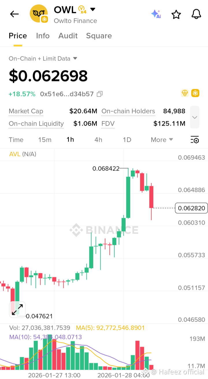 OWL Update: After hitting +21%, OWL is seeing some profit-taking and is now at +18.57%. Price is holding around 0.062. Is this a dip-buy or the start of a trend reversal?