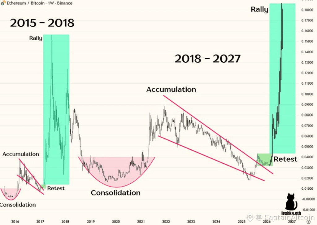 Ethereum price action during this consolidation looks ordinary on the surface. Zooming out tells a very different story. According to analyst Leshka.eth, the current ETH structure mirrors a historical pattern that once preceded an explosive rally. The chart shows a long accumulation phase followed by a clean breakout and retest. That same structure appeared years ago before Ethereum surged from $56 to $1,151.