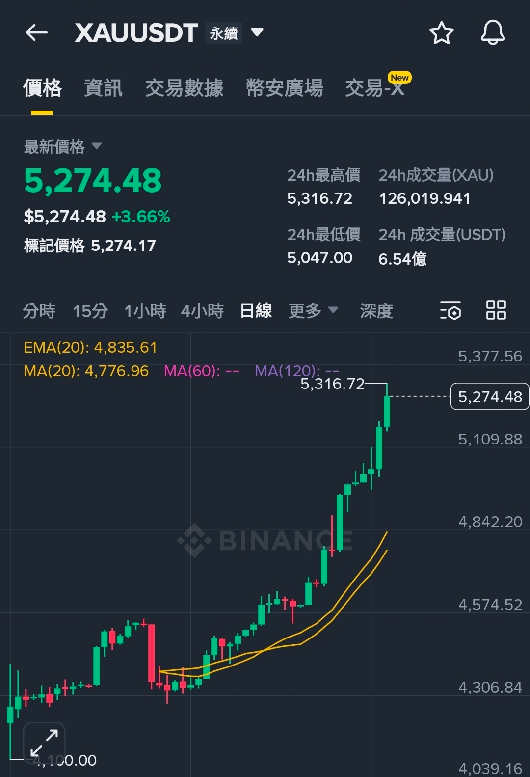 The gold perpetual contract (\u003cc-34/\u003e) has surged dramatically, starting from over 4,000 in January 2026 and breaking through 5,300. Just looking at the daily candlestick chart, one might think it's a pump and dump from a meme coin, but this is the real daily gold chart erupting. The world's number one safe-haven asset, physical gold RWA, crushes Bitcoin as the 'digital gold.'