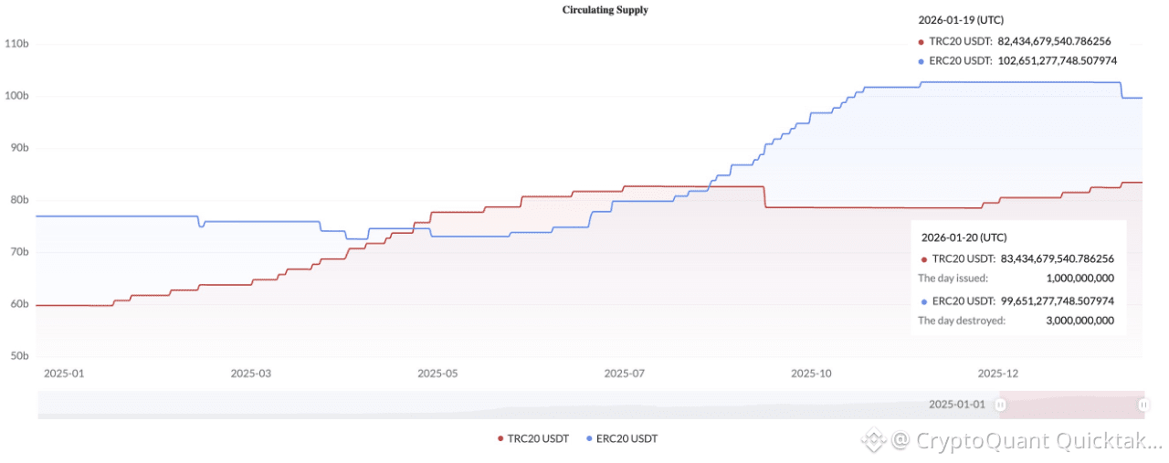 When USDT + USDC shrink on Ethereum while USDT expands on Tron, the simplest read is: Liquidity is changing rails, not disappearing.