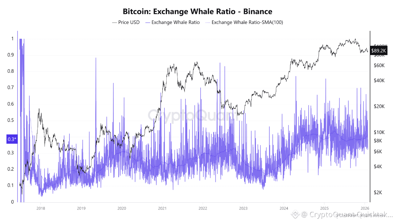 The chart reveals a clear and recurring behavior. When the Whale Ratio rises, price reactions typically unfold in three stages. In the first stage, price remains strong while the Whale Ratio increases. During this phase, price often continues to rise or moves sideways because selling pressure has not yet been priced in.