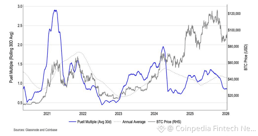 Meanwhile, the other metric “Puell Multiple” has slipped to 0.9, which is suggesting that miner revenues have only fell modestly below their annual average historically this a signal of tightening margins rather than distress.