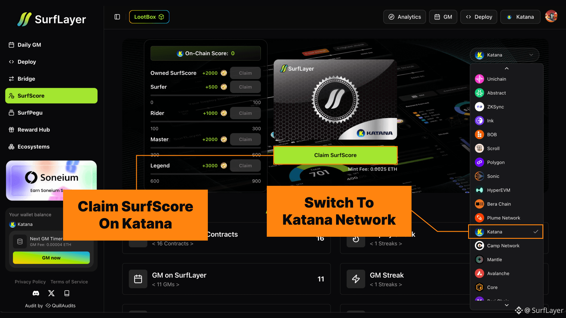 Users can mint a separate SurfScore for each supported network, including Katana.