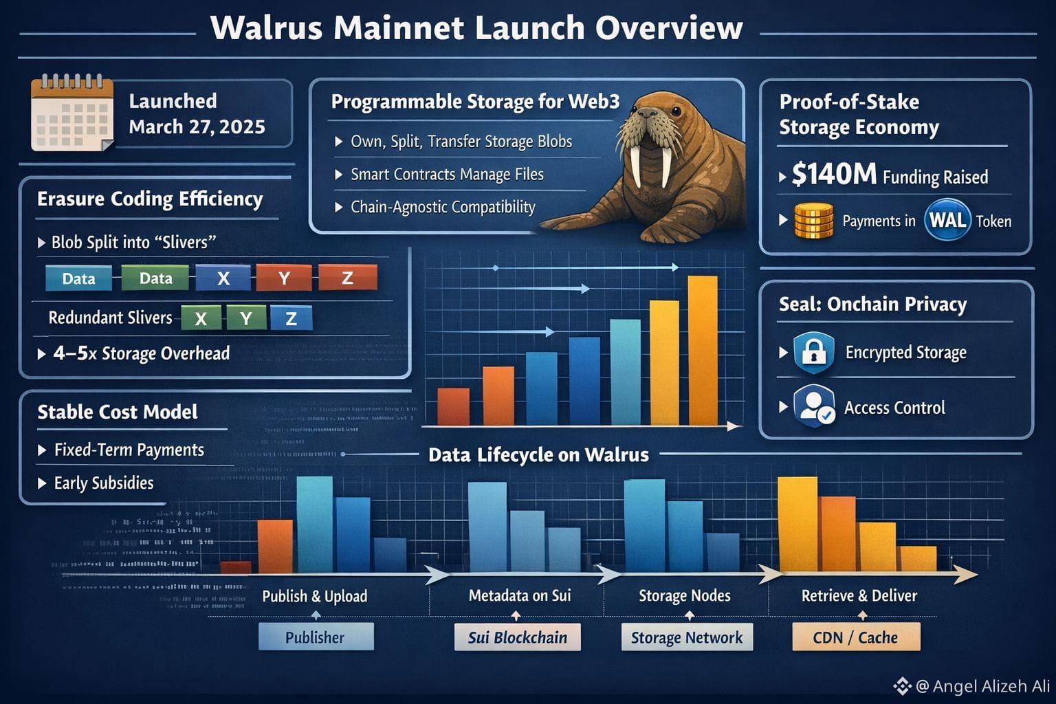 @Walrus 🦭/acc Storage is rarely the part of a blockchain story that makes people lean forward. It’s the dull plumbing in the background, the thing teams “figure out later” right up until later arrives and an app is suddenly shipping videos, game assets, AI outputs, or user histories. That’s why Walrus’ public mainnet launch on March 27, 2025 mattered: it didn’t promise a new financial primitive so much as it tried to fix the basic problem of where Web3 apps put the large files that don’t fit neatly into a transaction.