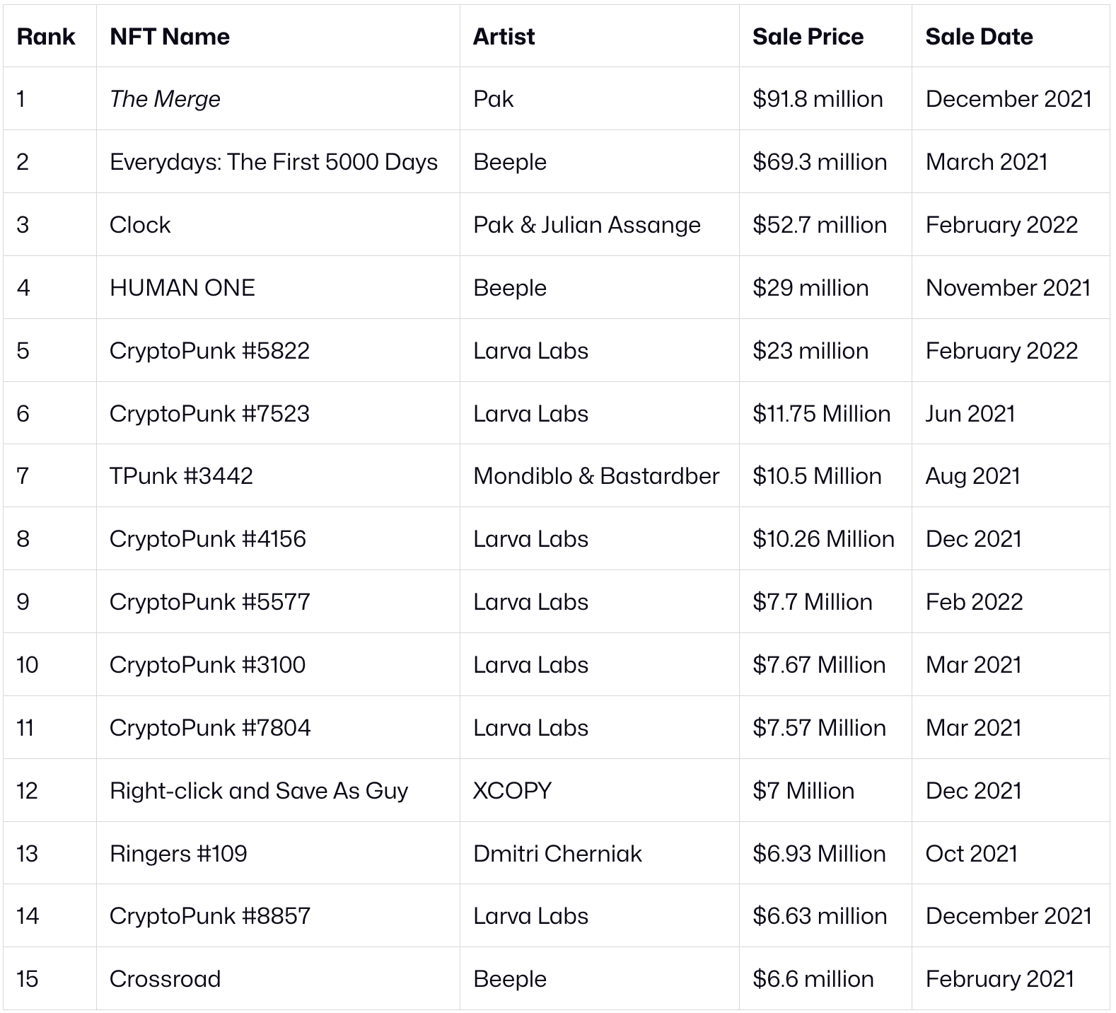 Other expensive NFTs sold include Beeple's Everydays the First 5000 Days, Clock, HUMAN ONE, and CryptoPunk #5822.